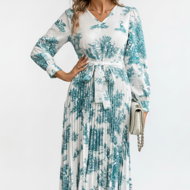 Confeccionado en un delicado tono blanco con estampado en verde agua, este vestido de largo midi destaca por su falda plisada que aporta movimiento y ligereza.