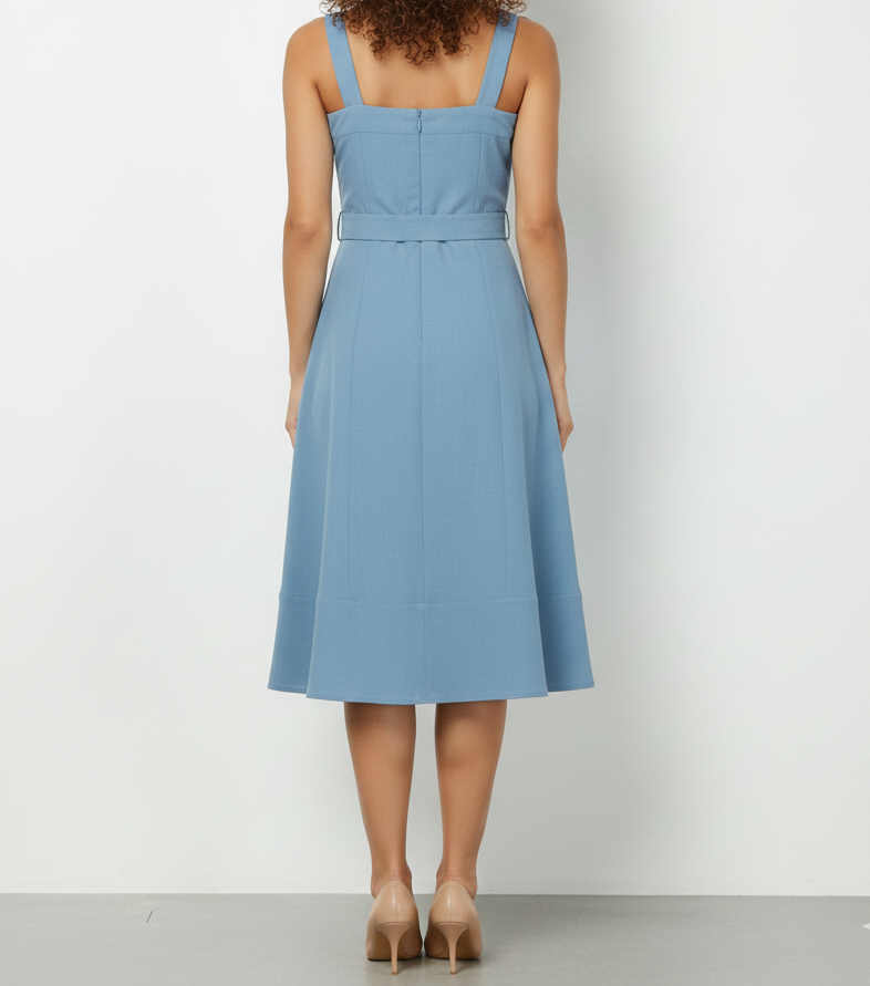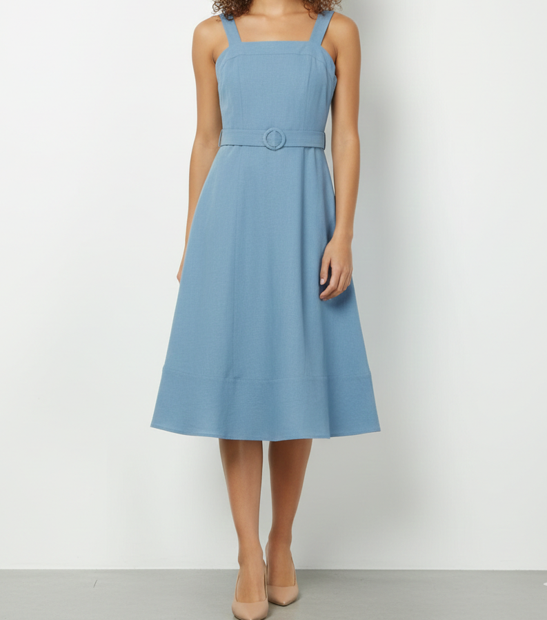 Este elegante vestido midi en tono azul suave combina simplicidad y estilo en una prenda versátil. Presenta un escote recto con tirantes anchos que aportan estructura, junto con un cinturón del mismo tejido que define la cintura y realza la silueta de forma delicada. Su falda de caída fluida brinda movimiento y comodidad, convirtiéndolo en una opción ideal tanto para ocasiones casuales como para eventos semi-formales