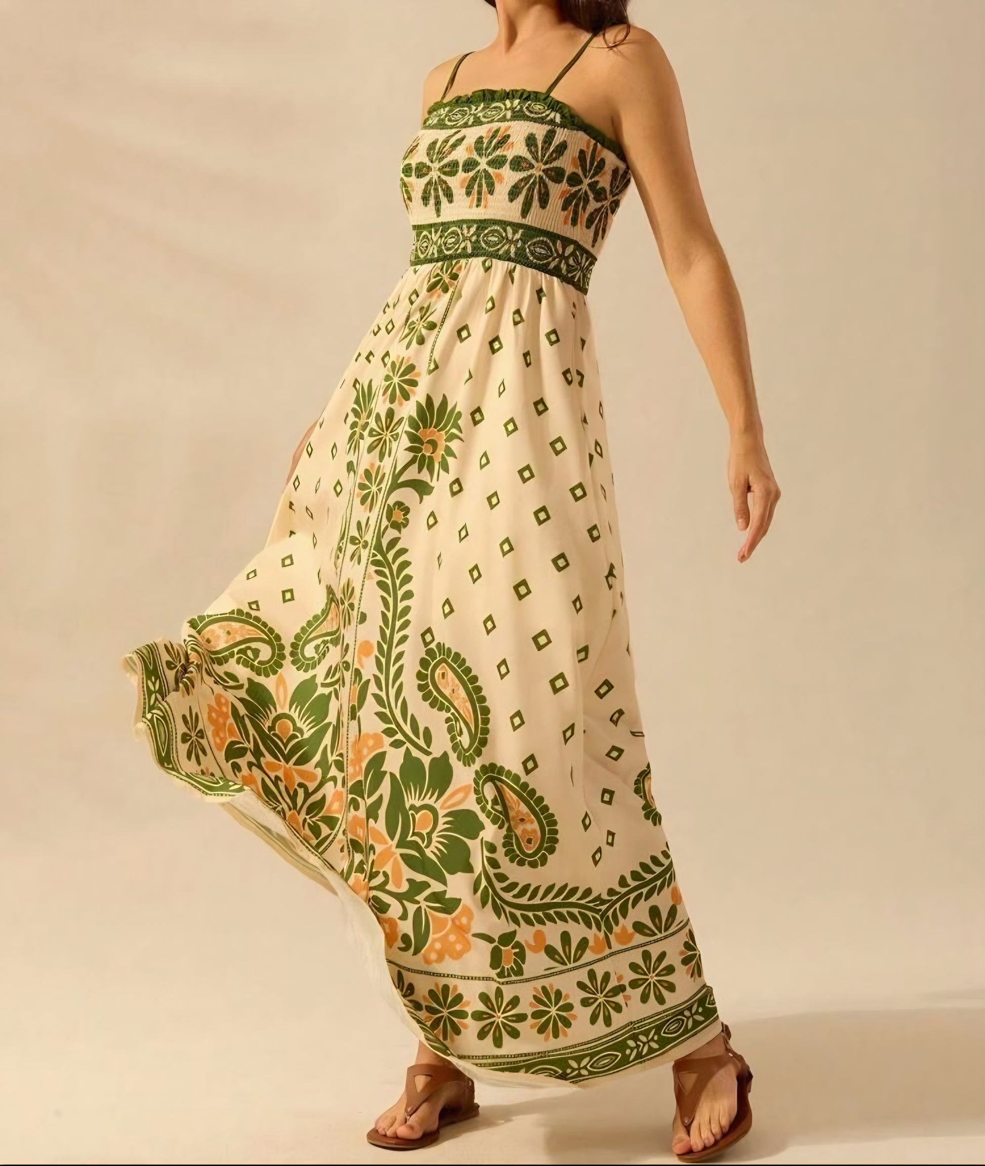 Este hermoso vestido largo destaca por su diseño fresco y femenino, ideal para los días cálidos. Confeccionado en una tela ligera y fluida, presenta un delicado estampado floral y geométrico en tonos verdes y naturales que evocan un estilo bohemio y elegante. Su busto ajustado con tirantes finos realza la silueta, mientras que la falda amplia aporta movimiento y comodidad. Perfecto para paseos de verano, vacaciones, eventos al aire libre o looks relajados con un toque sofisticado.