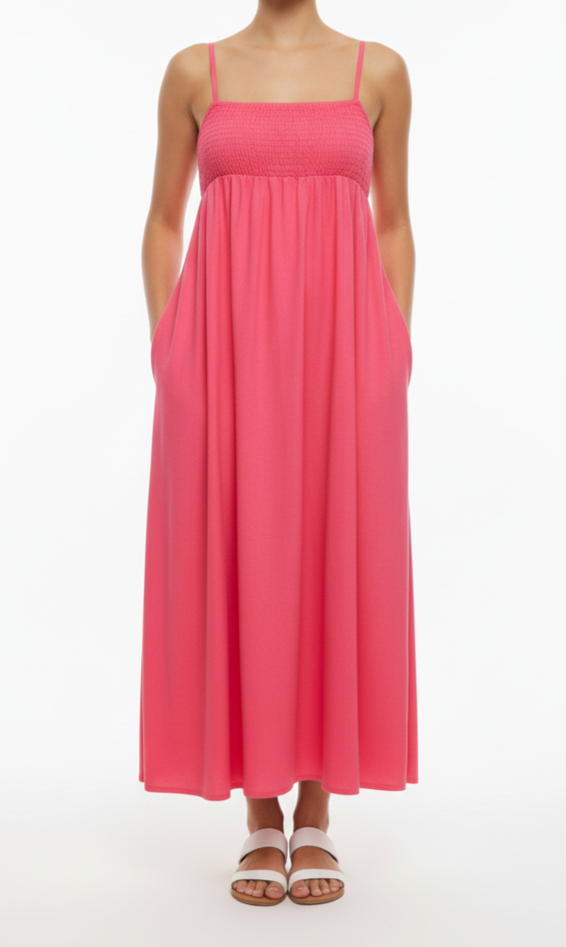 Vestido largo de tirantes finos en un vibrante tono coral. Presenta un busto fruncido tipo smock que se ajusta cómodamente y realza la silueta, mientras que la falda fluida aporta ligereza y movimiento. Fresco, cómodo y muy versátil, es ideal para días de verano, paseos o looks casuales con sandalias o tenis.