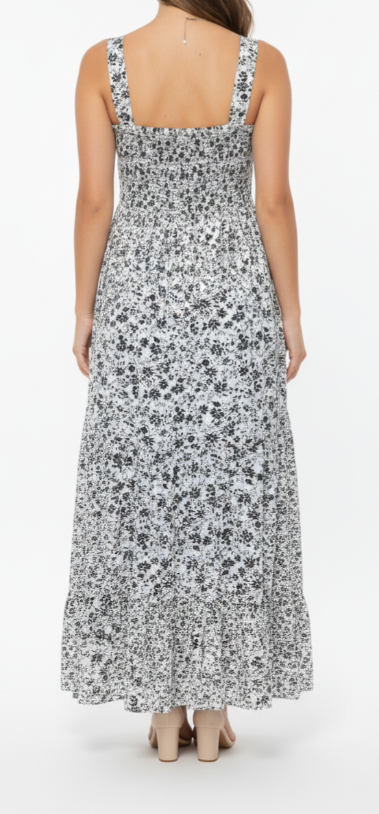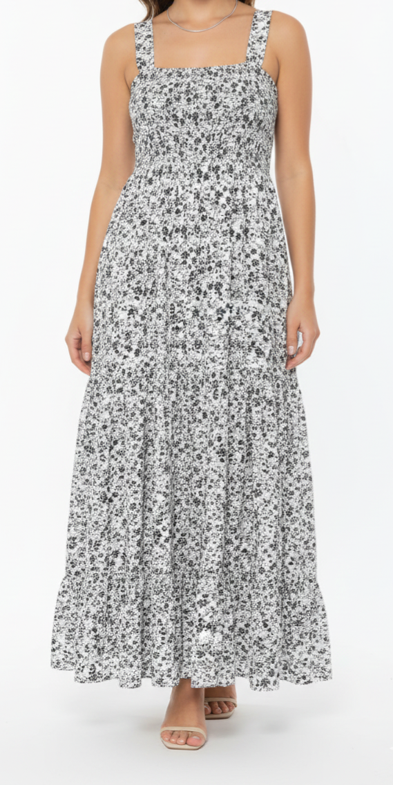 El vestido maxi es la elección perfecta para un look femenino, fresco. Confeccionado en una tela ligera con delicado estampado floral en tonos morado, amarillo y blanco con negro, presenta un escote cuadrado y tirantes anchos que aportan comodidad. Su cuerpo fruncido se adapta suavemente a la silueta, mientras que la falda larga de cortes escalonados añade movimiento y fluidez. Ideal para días soleados, paseos, vacaciones o eventos casuales.